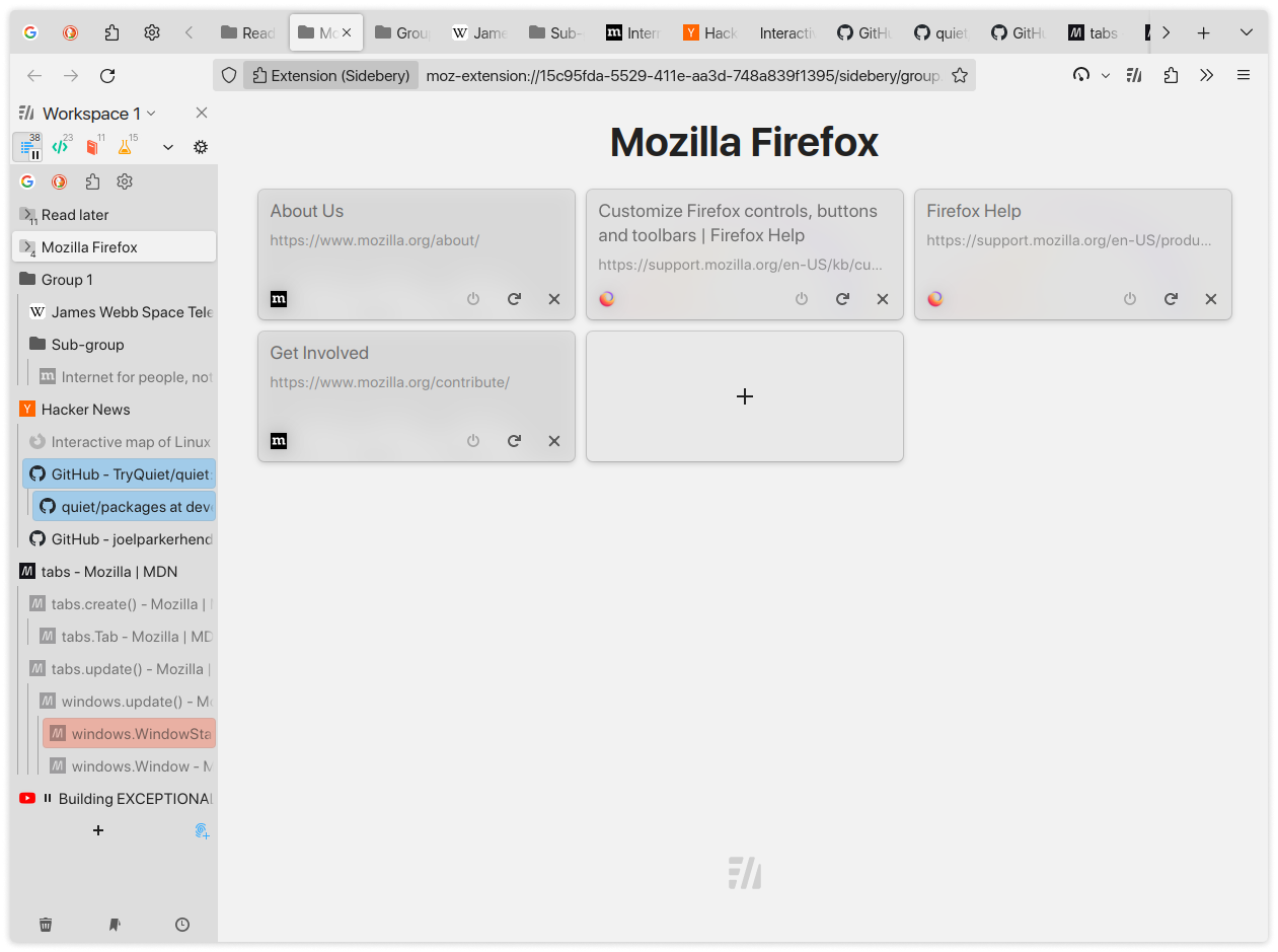 Full UI mode. Sideberry’s sidebar holds the vertical tabs and the URL bar. Everything Firefox normally scatters across the top of the window lives in one panel that you can toggle away.